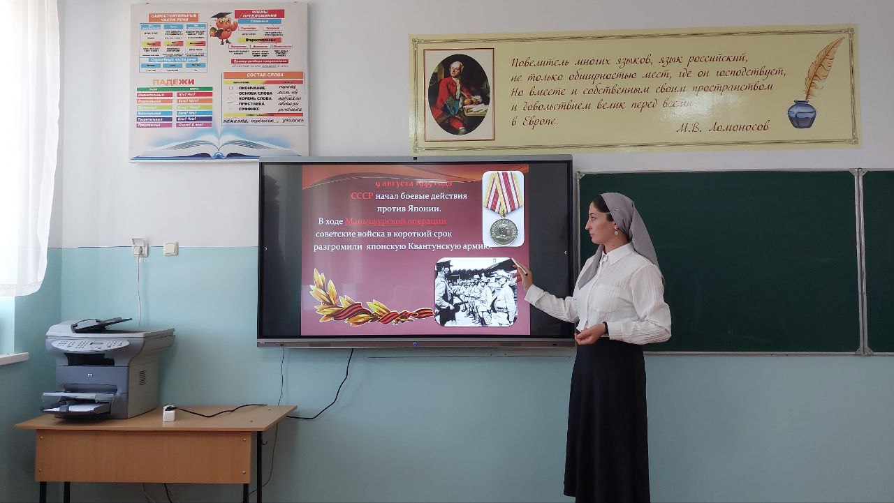 04.09.20233 сентября - День окончания Второй мировой войны. В преддверии памятной даты в МБОУ «Элистанжинская СОШ им. Битимирова Х.Х.» был проведён Урок Памяти. У времени есть своя память – история. И поэтому мир никогда не забывает о трагедиях, потрясавших планету в разные эпохи, в том числе и о жестоких войнах, уносивших миллионы жизней, отбросивших назад цивилизации, разрушавших великие ценности, созданные человеком. 4 сентября под руководством Советника по воспитанию МБОУ «Элистанжинская СОШ им. Битимирова Х.Х.» Хукаева Марем Расуловна провела урок Памяти с учениками 9х классов, посвящённые Дню окончания Второй мировой войны. Мы не имеем права забывать ужасы этой войны, чтобы она не повторялась вновь.