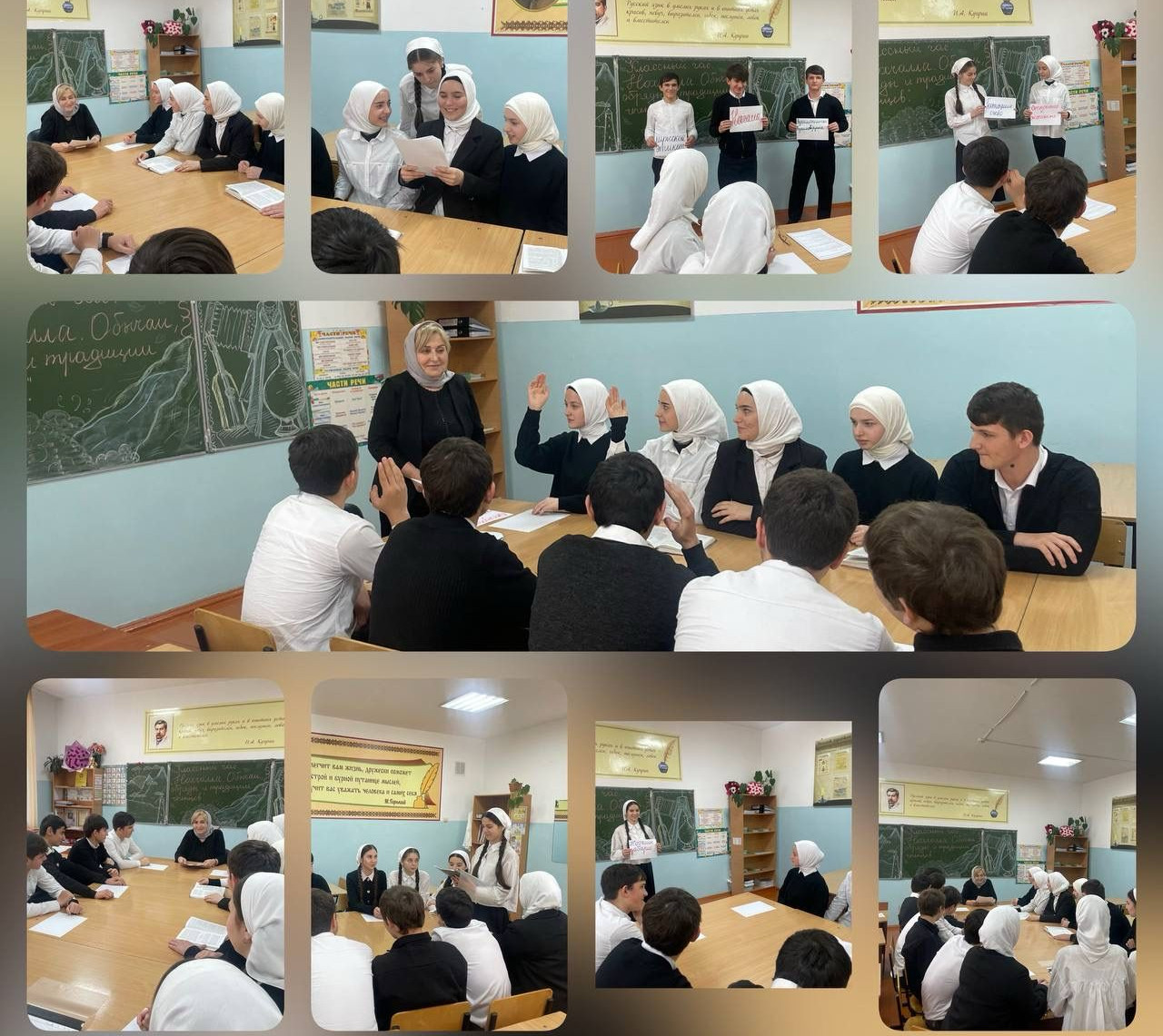 23.01.2024Сегодня, 23 января 2024г., классный руководитель 9 Б класса Азиева М.Ш. провела классный час на тему: «Нохчалла. Обычаи, обряды и традиции чеченцев». Она в доступной форме, красочно рассказала о ценности чеченских традиций и обычаев. Рассказала, что в каждой чеченской семье чтут и соблюдают традиции, переданные старшим поколением. Одной из главных традиций чеченского общества является сохранение семейного этикета и уважение к гостям. Особенности чеченского народа – уважение к старшему поколению, порядочность, честность, вежливость, богобоязненность, милосердие.