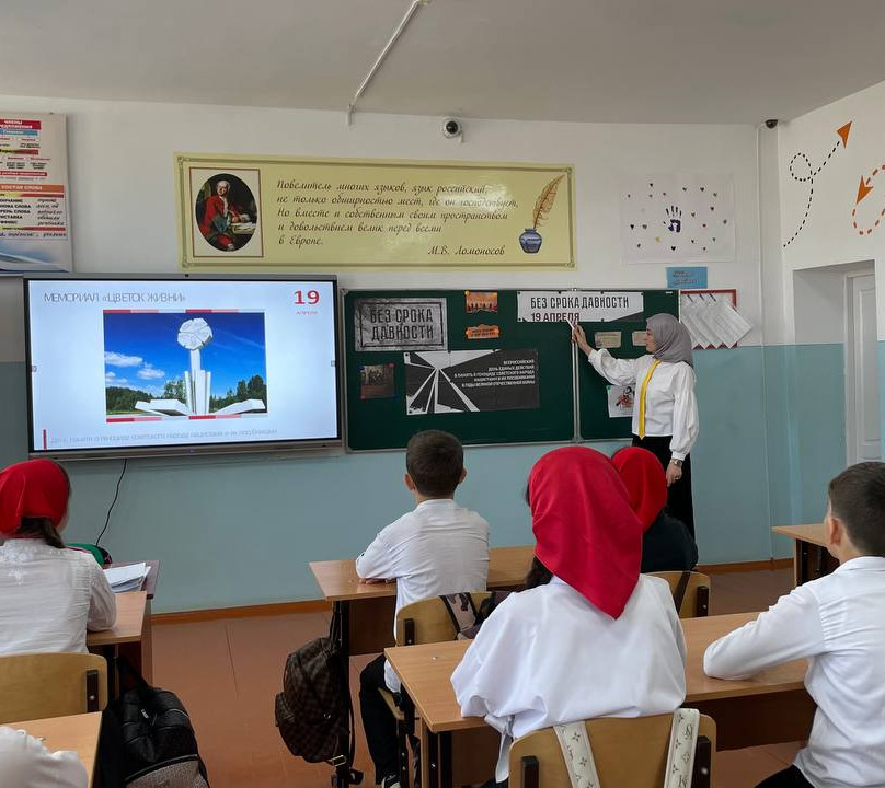 Советник директора по воспитанию Хукаева М.Р. провела урок мужества «Памяти жертв геноцида» для учащихся 5-х классов, на котором шел разговор о необходимости сохранения памяти об ужасах войны, о понятии «геноцид» и ответственности за преступление по статье «геноцид» в национальном и международном праве. Учащиеся послушали историческую справку о зверствах фашистских захватчиков, и о численности населения захваченных территорий до войны и после войны.