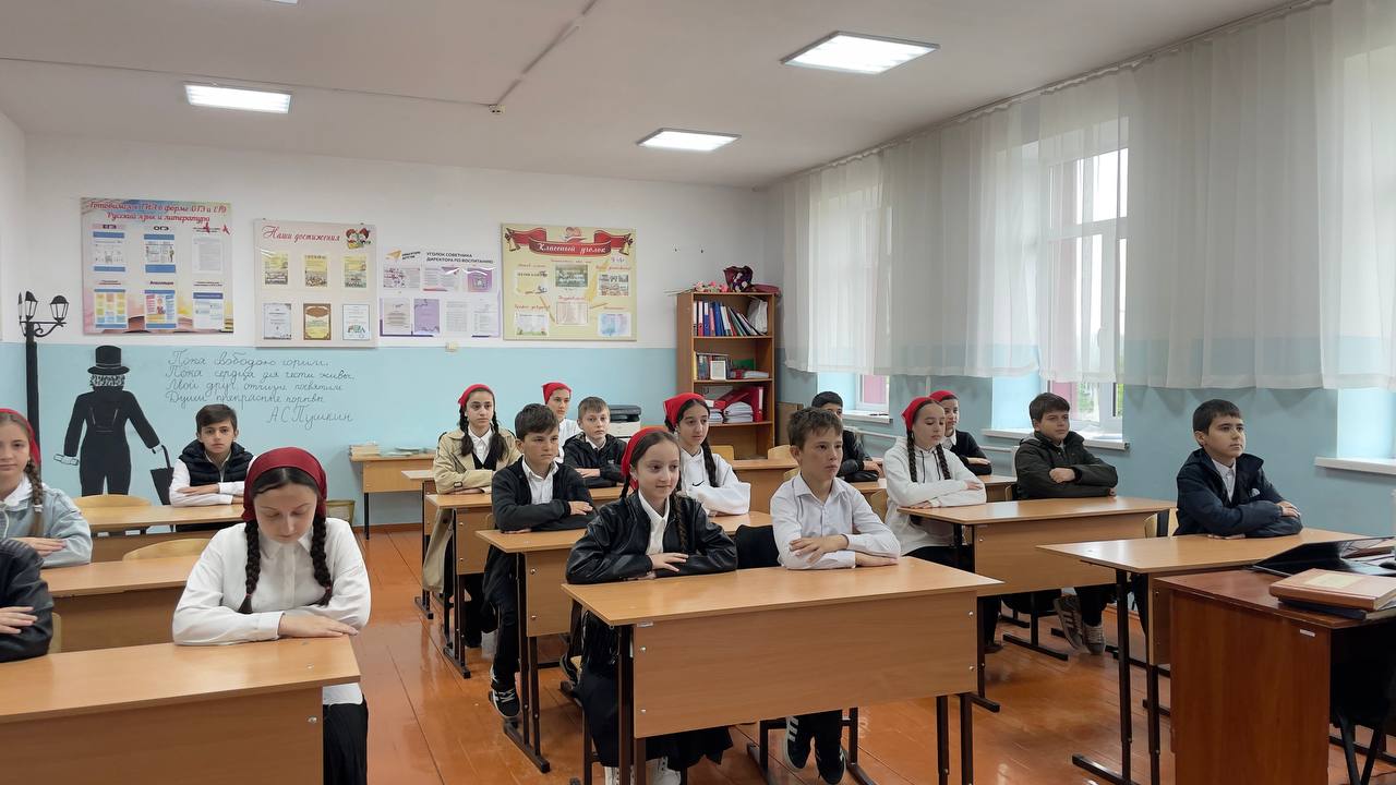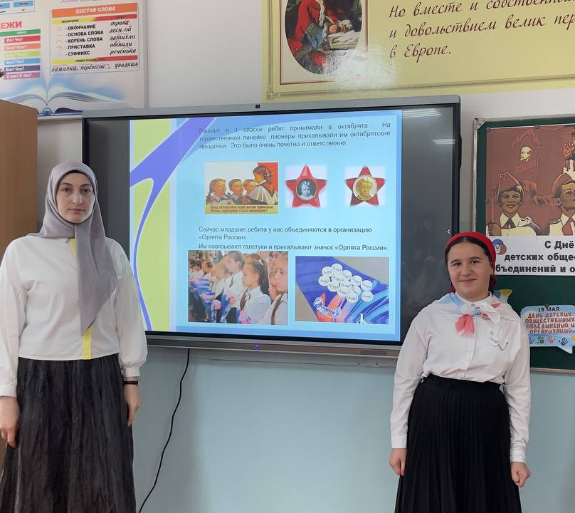 Советник директора по воспитанию Хукаева М.Р. с учащимися 5-ых классов провела открытый урок. В рамках урока школьники узнают об истории пионерии, современных проектах и о том, какие возможности открываются для участников Российского движения детей и молодёжи (РДДМ) «Движение Первых» и «Орлята России».